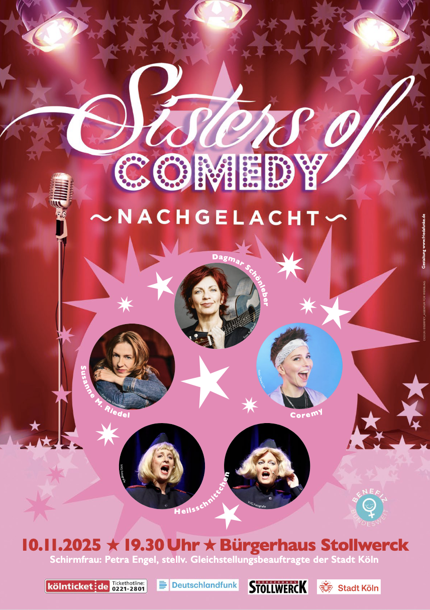 Zum fünften Mal präsentiert die Kabarettistin Dagmar Schönleber als „Kölner Patin“ das bundesweit stattfindende Benefizevent zugunsten lokaler Frauenhilfsprojekte. Dagmar Schönleber moderiert sozusagen als Oberschwester seit Anbeginn der Zeit das alljährliche Sisters of Comedy-Event, wie immer mit Worten, Wumms und Westerngitarre. Mit Dabei: Coremy, Susane Riedel, die Heilsschnittchen. Durch den niedrigen Eintrittspreis werden lediglich die Unkosten Der Künstlerinnen bzw. des Bürgerhauses Stollwerck gedeckt. Deshalb wird zugunsten des lokalen Frauenprojektes wird eine Spende von 10,00 € pro Karte (auch Gasttickets) erbeten. |
